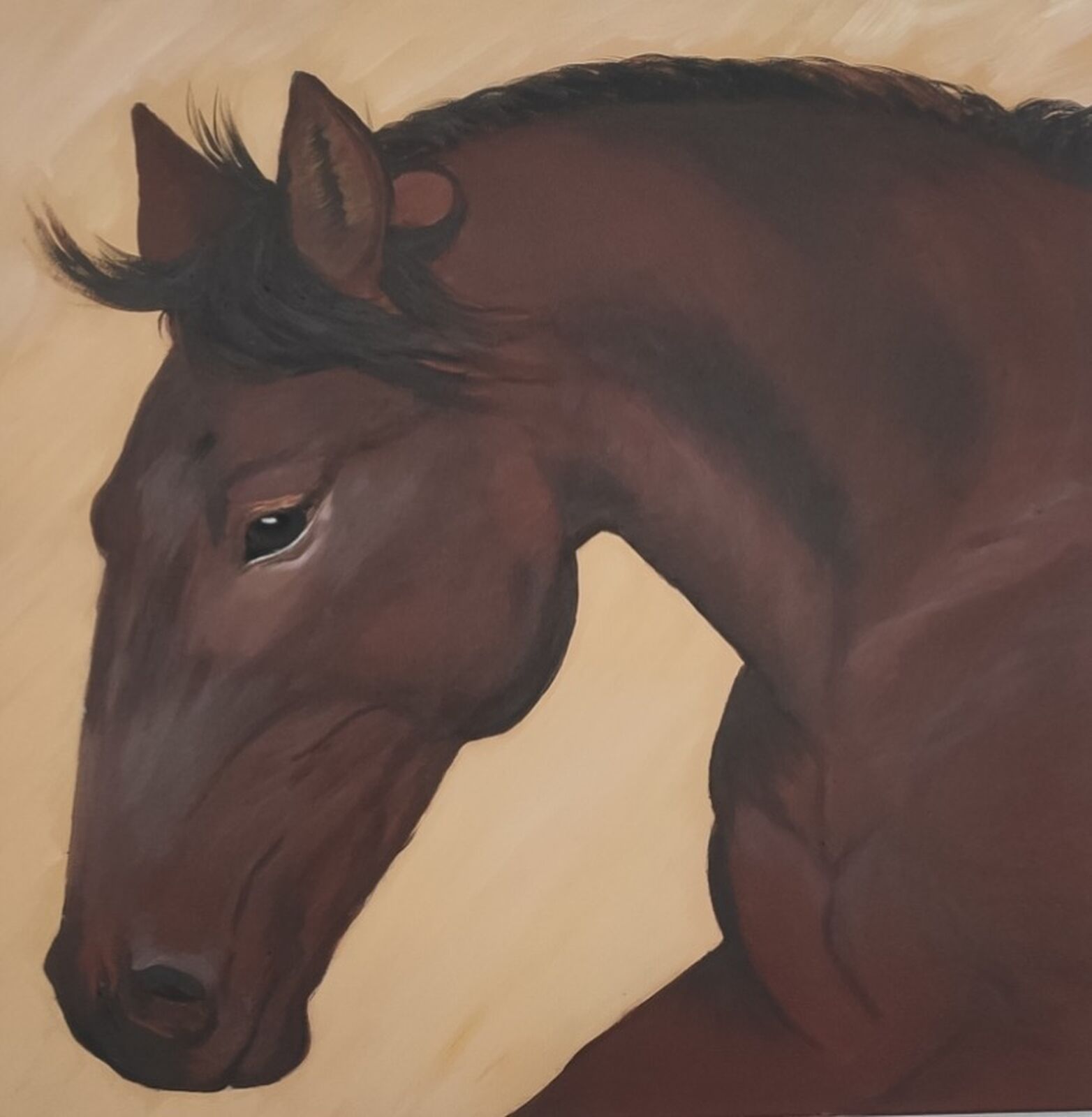 | Opis: | Portret konia ukazany w profilu.Dominuje ciepły brązowy kolor. |