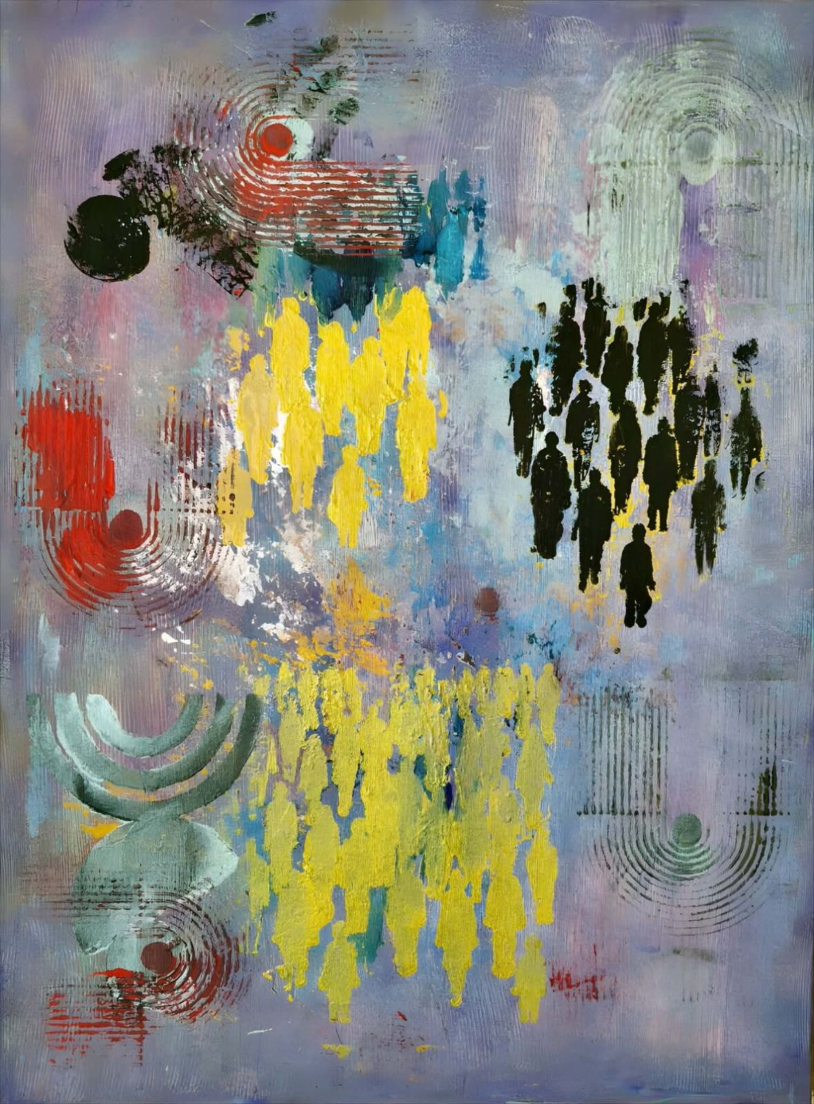 | Opis: | „Społeczny krajobraz” to abstrakcyjna kompozycja badająca relacje między jednostką a zbiorowością w rzeczywistości kształtowanej przez technologię. Centralnym motywem pracy są sylwetki ludzi przedstawione w dwóch kontrastujących grupach. Jedna z nich, utrzymana w czerni, zdaje się symbolizować anonimowość i jednolitość zbiorowości. Druga, w intensywnej żółci, tworzy dynamiczną, rozproszoną strukturę, sugerując ruch, energię i różnorodność ludzkich doświadczeń. Pomiędzy nimi pojawiają się abstrakcyjne formy i sygnałowe kręgi, które można interpretować jako metaforę sieci, komunikacji i niewidzialnych relacji łączących ludzi. Praca zaprasza widza do refleksji nad tym, jak w erze cyfrowej zmienia się pojęcie wspólnoty, obecności i tożsamości — oraz jak niewidzialne systemy komunikacji wpływają na krajobraz społeczny, w którym wszyscy funkcjonujemy. |