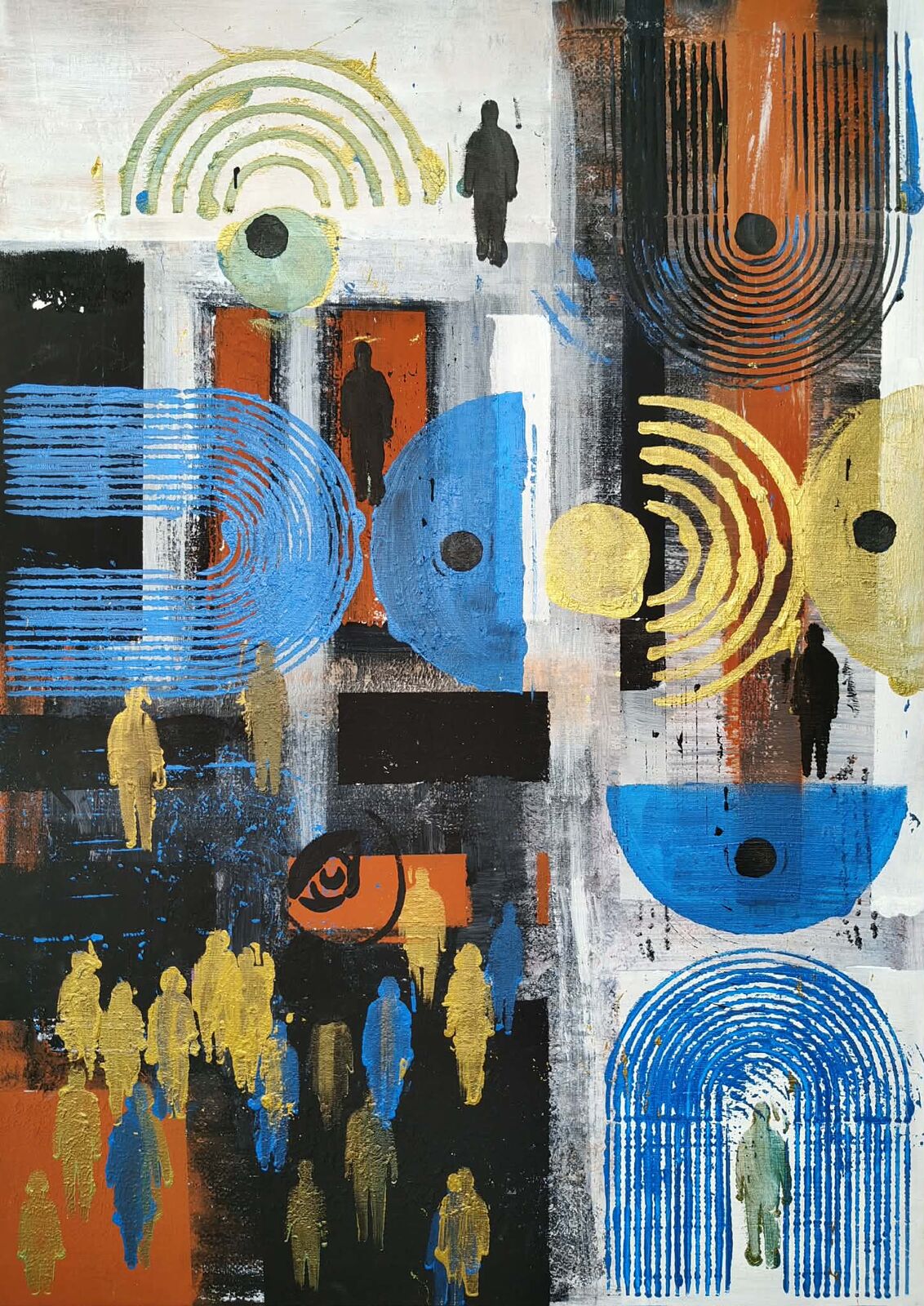 | Opis: | Obraz „Tłum przetworzony”, z serii „Społeczny krajobraz”, stanowi wielowarstwową, abstrakcyjną narrację o współczesnym człowieku zanurzonym w strukturach zbiorowości. Ludzkie sylwetki — uproszczone, anonimowe i zwielokrotnione — pojawiają się pośród form geometrycznych oraz rytmicznych układów linii, które przywodzą na myśl fale, impulsy lub systemy komunikacji. Artysta zestawia porządek i chaos. Z jednej strony powtarzalność i wzór, z drugiej — indywidualne ścieżki ukryte w gęstej tkance kompozycji. Obraz nie jest jedynie obserwacją — to refleksja nad tym, w jaki sposób współczesne systemy kształtują ludzką obecność, redukując ją do wzoru, sygnału lub fragmentu większej całości. |